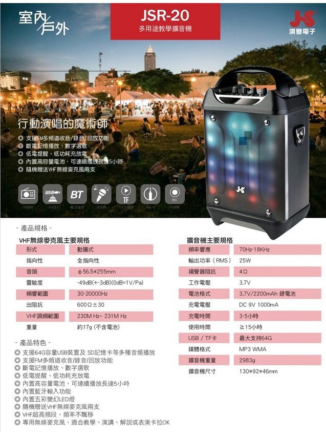 內置五彩變幻LED燈,可隨旋律、音量變化,炫彩吸睛。隨機贈VHF無線麥克風,可調ECHO,聲音和卡拉ok功能完美呈現。